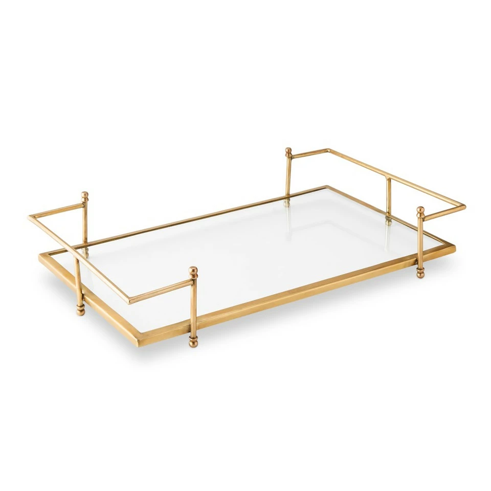 Evoking the look and luster of art deco design, our stunning tray brings unparalleled style to entertaining. Defined by the distinctive warmth of antique brass and hand-hammered glass, the tray shines with bold simplicity. Conveniently display glassware, decanters, bottles and more on the spacious glass base.