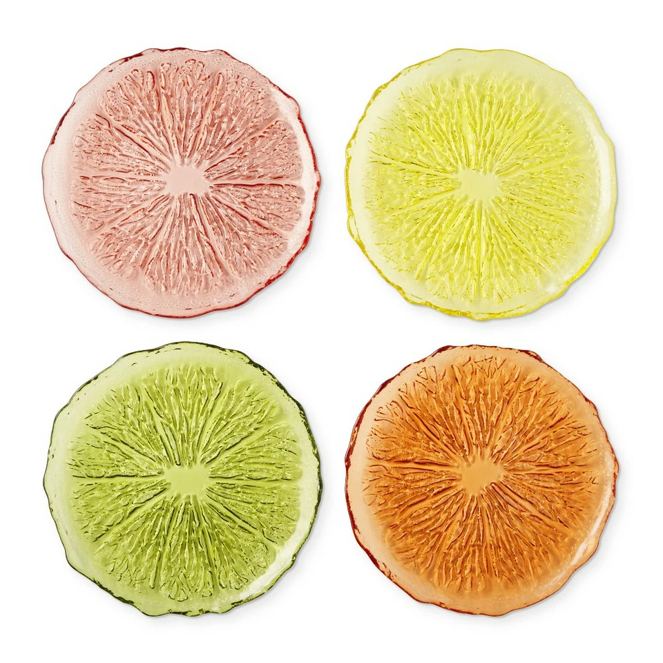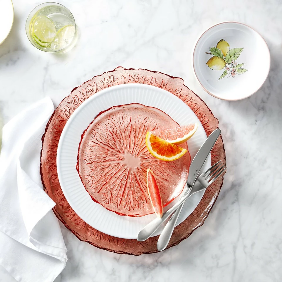 Inspired by the Amalfi Coast, our colourful Citrus dinnerware adds a refreshing, summery twist to your favourite recipes all year long. These salad plates are made of durable transparent glass with embossing that mimics the lines and texture of cut citrus.