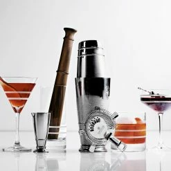 - Set includes Boston shaker, Hawthorne strainer, jigger and wooden muddler.