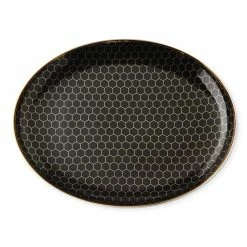 For a gathering that shimmers with warmth, set the table with our eye-catching collection. Featuring a graphic, architectural honeycomb design and an 18 carat gold rim, this platter presents food beautifully and layers well with white-glazed porcelain dinnerware and servingware.