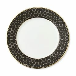 For a gathering that shimmers with warmth, set the table with our eye-catching collection. Bordered in black and adorned with 18 carat gold honeycombs and rims, these plates frame food beautifully and layer well with white-glazed porcelain dinnerware and servingware.