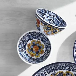 Handpainted ceramics inspired the vibrant design of our Maravilla collection, decorated with botanical designs in shades of marigold, poppy and ocean blue. Crafted of durable melamine, the dipping bowls are ideal for outdoor entertaining as well as everyday family meals.