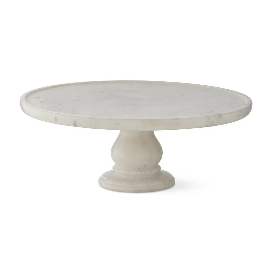 Handcrafted from solid white marble, this stand makes an elevated presentation of anything from cheeses and accompaniments to whole cakes to hors d’oeuvres and confections. The top has a low lip to help keep food in place, and it rests on a gracefully turned marble foot. Variations in the stone’s natural grey veining make each stand unique.