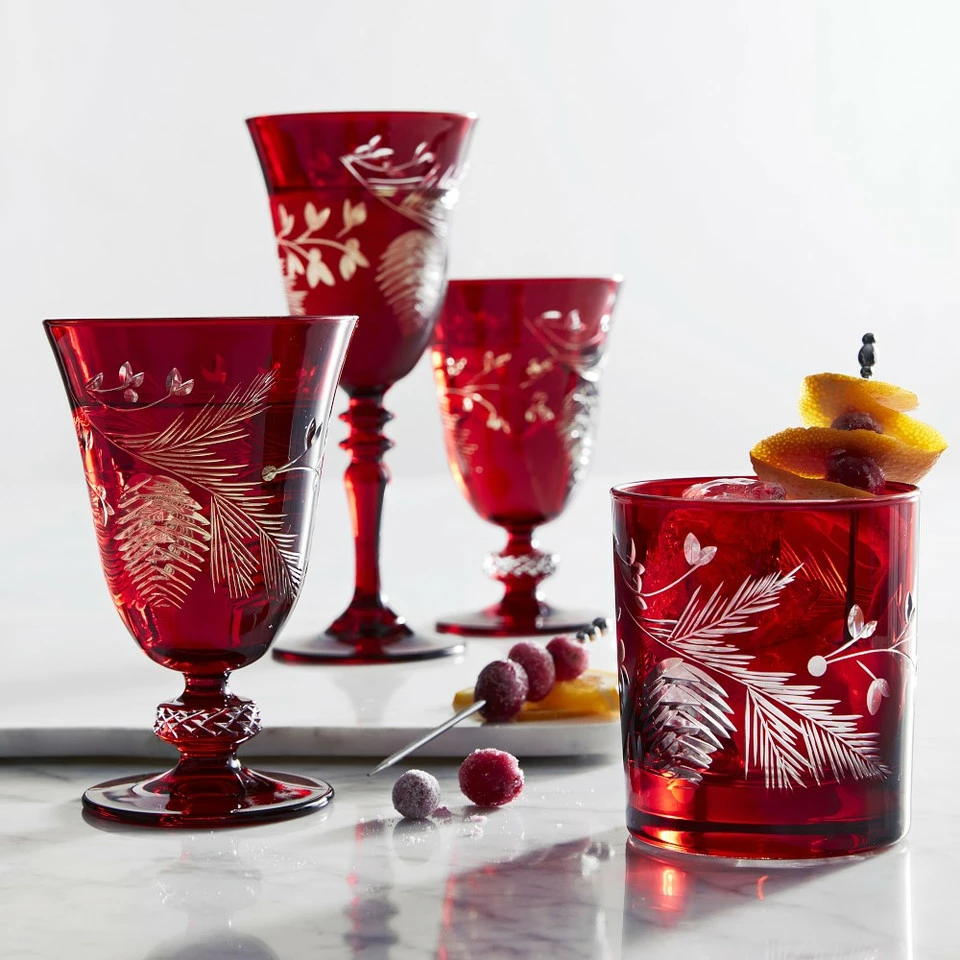 Hand cut with an intricately detailed pinecone motif, our classic barware is perfect for festive gatherings. Inspired by vintage glassware, each sparkling wine glass is cut by a master craftsperson and painted a deep red. The flared shape is ideal for serving both red and white wine.