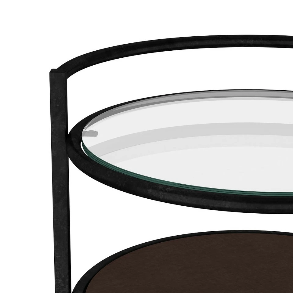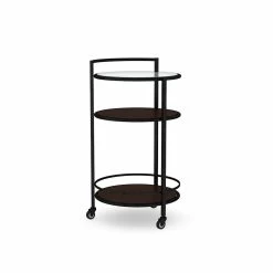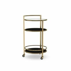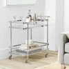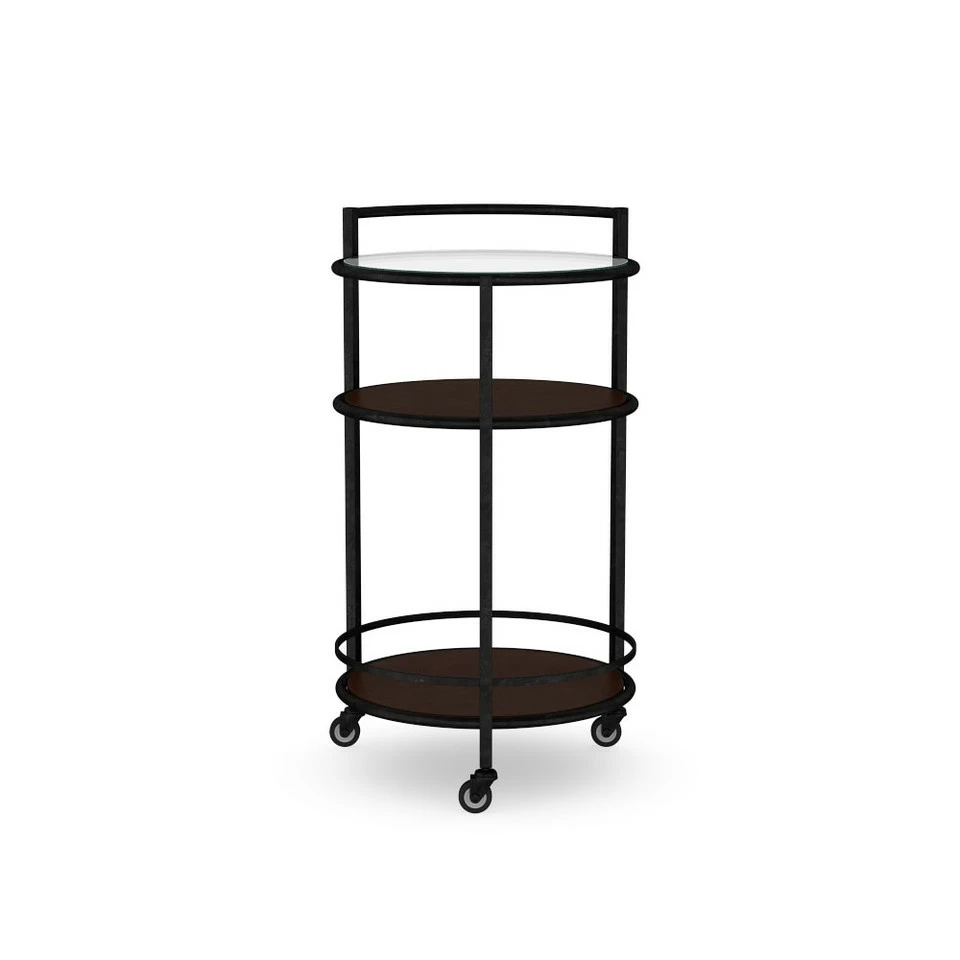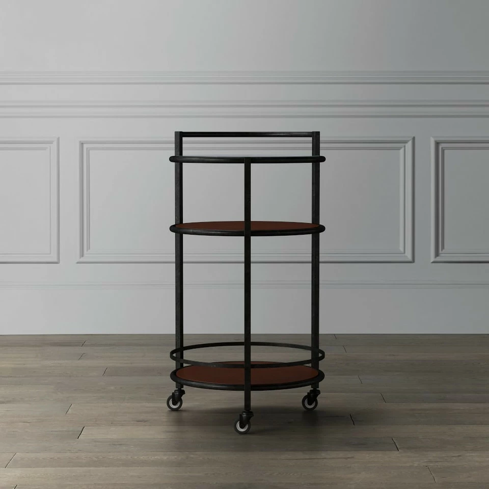 Our cart’s tempered glass top provides space for mixing and pouring, while two leather-clad shelves offer ample storage for glassware and spirits โ all in a remarkably compact footprint. A gallery rail secures the contents of the bottom shelf, and the top handle doubles as a rack to hold a bar towel. Swiveling castors allow the cart to move easily from dining room to living room to terrace โ wherever guests gather.