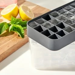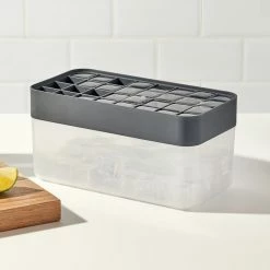 Freeze up to 96 ice cubes in one compact container. This cleverly made ice box features a silicone lid that creates 32 ice cubes at once and a durable container that holds nearly 100 of them. The stackable design keeps odours out and allows space-saving storage in the freezer.