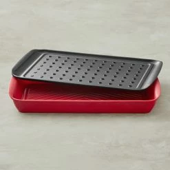 - Top tray nests perfectly in lower tray and features a textured surface and perimeter wall to elevate food and contain drippings.