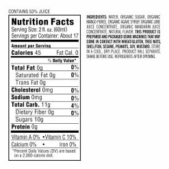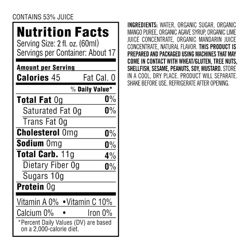 Ingredients:Water, organic sugar, organic mango puree, organic agave, organic lime juice concentrate, organic mandarin juice concentrate, natural flavour.